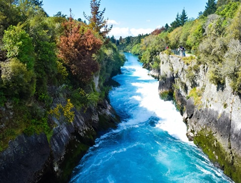 飯店早餐後,前往★懷奧塔普地熱世界, Wai-O-Tapu彩虹香檳池地熱公園,是紐西蘭最繽紛的地熱景點。這裡由於地熱活動而形成了獨特的地貌,且能從路況良好的步道上近距離觀賞到獨一無二的火山奇景。這裡也是吳奇隆和劉詩詩婚紗照的拍攝地之一。體驗過地熱奇觀後,我們再去胡卡瀑布觀賞大自然的氣勢磅礴,懷卡托河由12公尺高的河道斷層沖瀉而下,造成每秒230噸巨量的水流, 噴射及向下的巨大動力,形成泡沫般的水瀑宣洩而下,這個瀑布由此得名「胡卡」(泡沫)。隨後前往陶波湖邊漫步,可嘗試獨特的湖中高爾夫,打卡最酷飛機麥當勞餐廳。