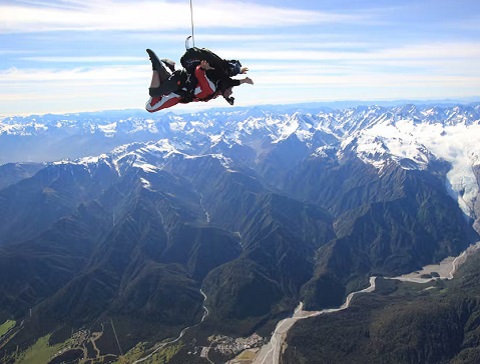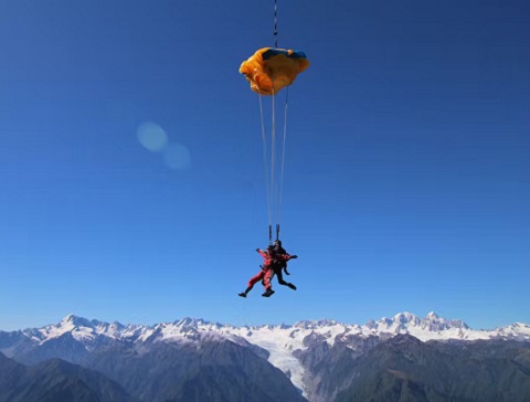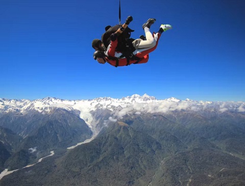 弗朗茲約瑟夫冰川(Franz Josef) 擁有新西蘭最高的奧拉基山/庫克山,右側是最大的福克斯冰川和弗朗茲約瑟夫冰川,左側是廣闊的藍色海洋。 在高山、冰川、湖泊、河流和海景之間享受弗朗茲約瑟夫 (Franz Josef) 高空跳傘。,被譽為地球上最美麗的地方之一。 由於這個原因,這地區被列入 Te Wahipounamu 世界遺產內。
