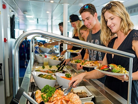 外礁船全天候開放,隨時可以享受空調的清涼!午餐在船上供應。船艙裡浮台上都有座位。