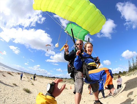 *經驗豐富的跳傘教練將部署主降落傘,下面的世界開始減速。(您選擇的海拔高度)讓您興奮安全自由。